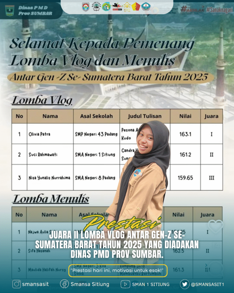 Sitiung, 11 November 2025 — Prestasi membanggakan kembali diraih oleh salah satu siswi SMA Negeri 1 Sitiung. Suci Rahmawati berhasil meraih Juara II Lomba Vlog yang diselenggarakan oleh Dinas Pemberdayaan Masyarakat dan Desa (PMD) Provinsi Sumatera Barat.